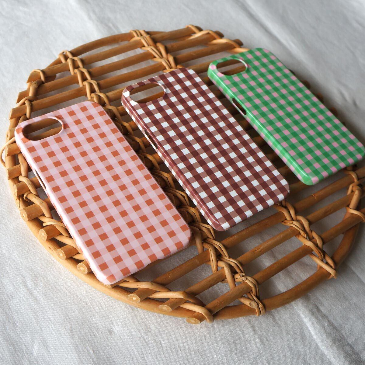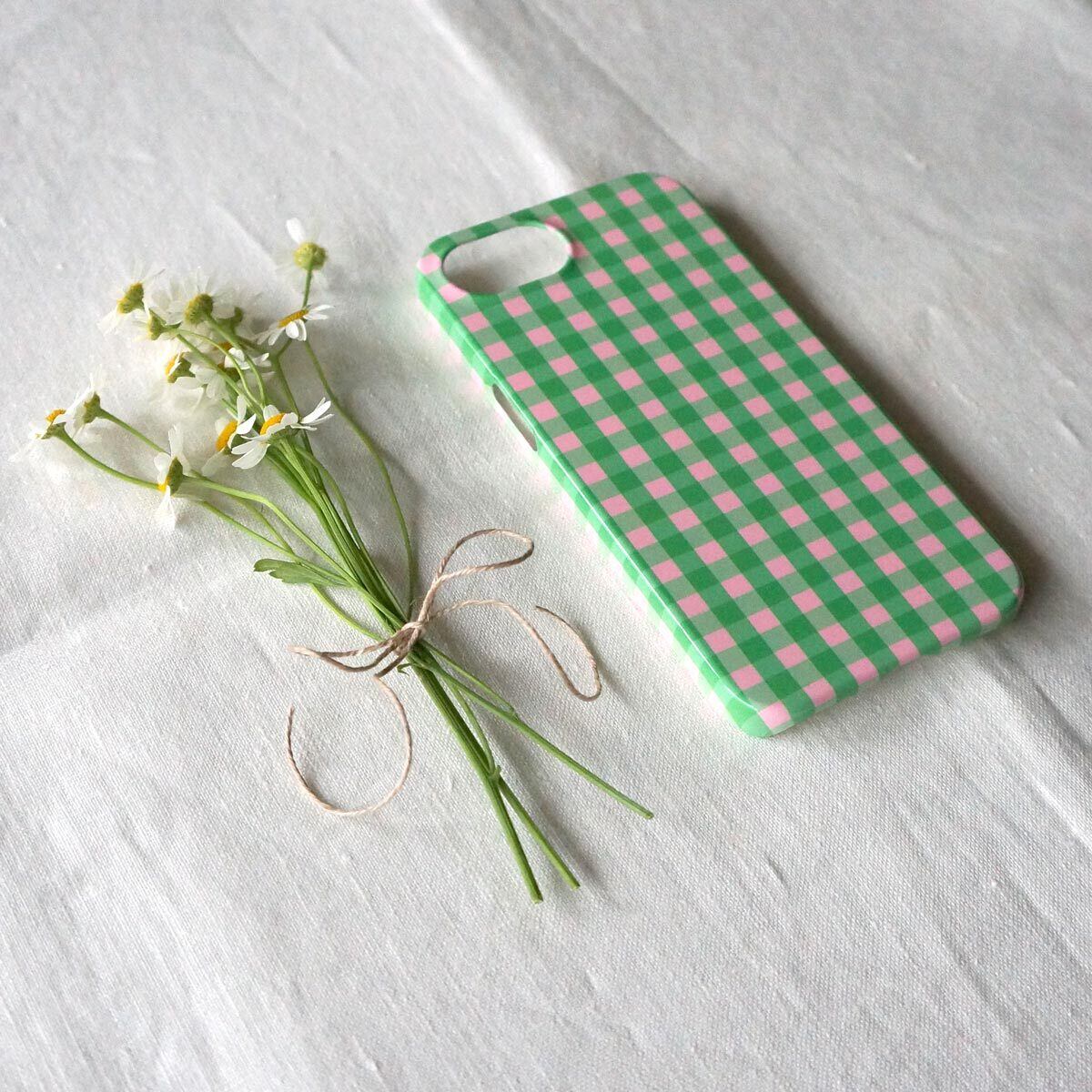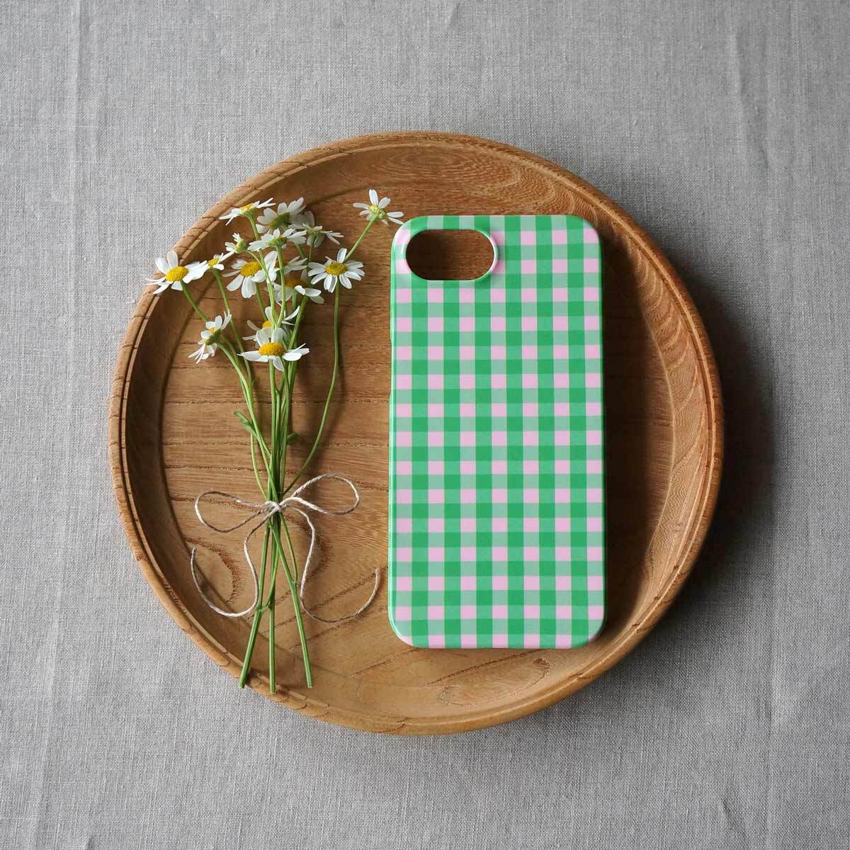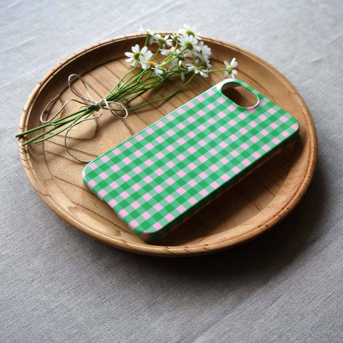 「 tokimeki gingham check( green & pink )」<ホワイトケース>【 側表面印刷 iPhoneケース 】
