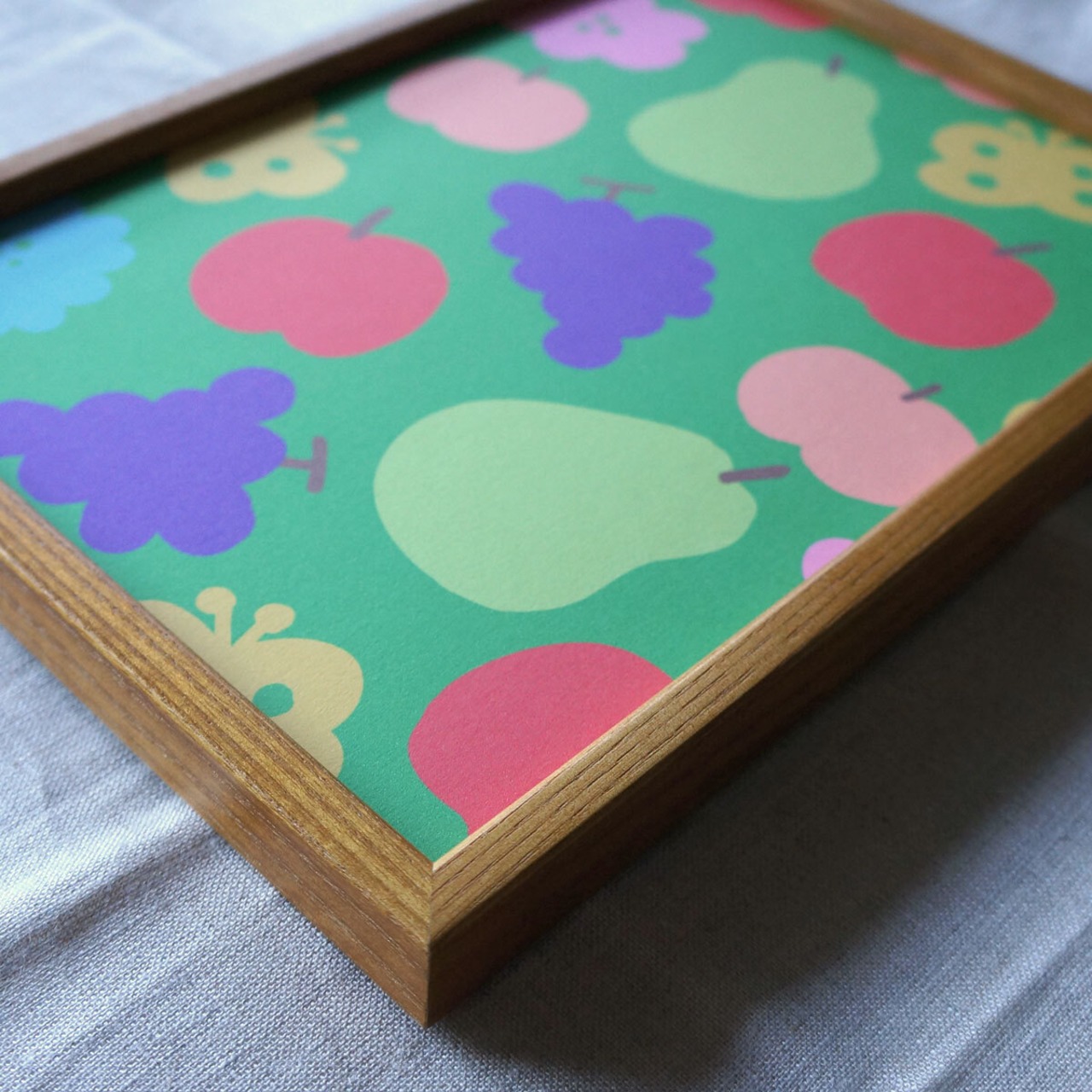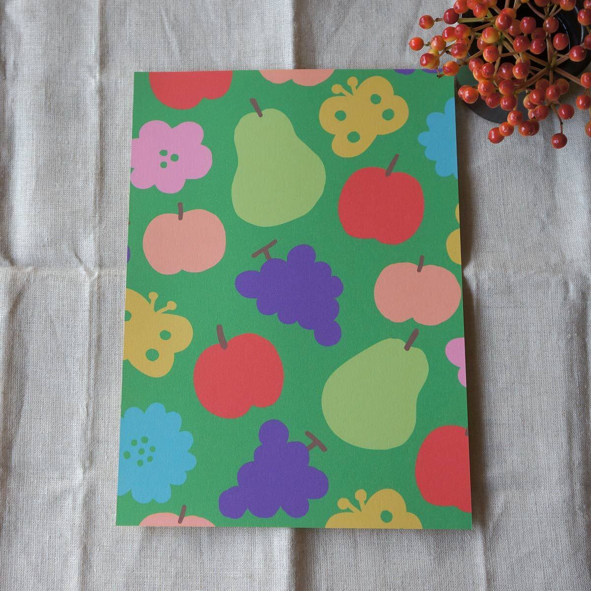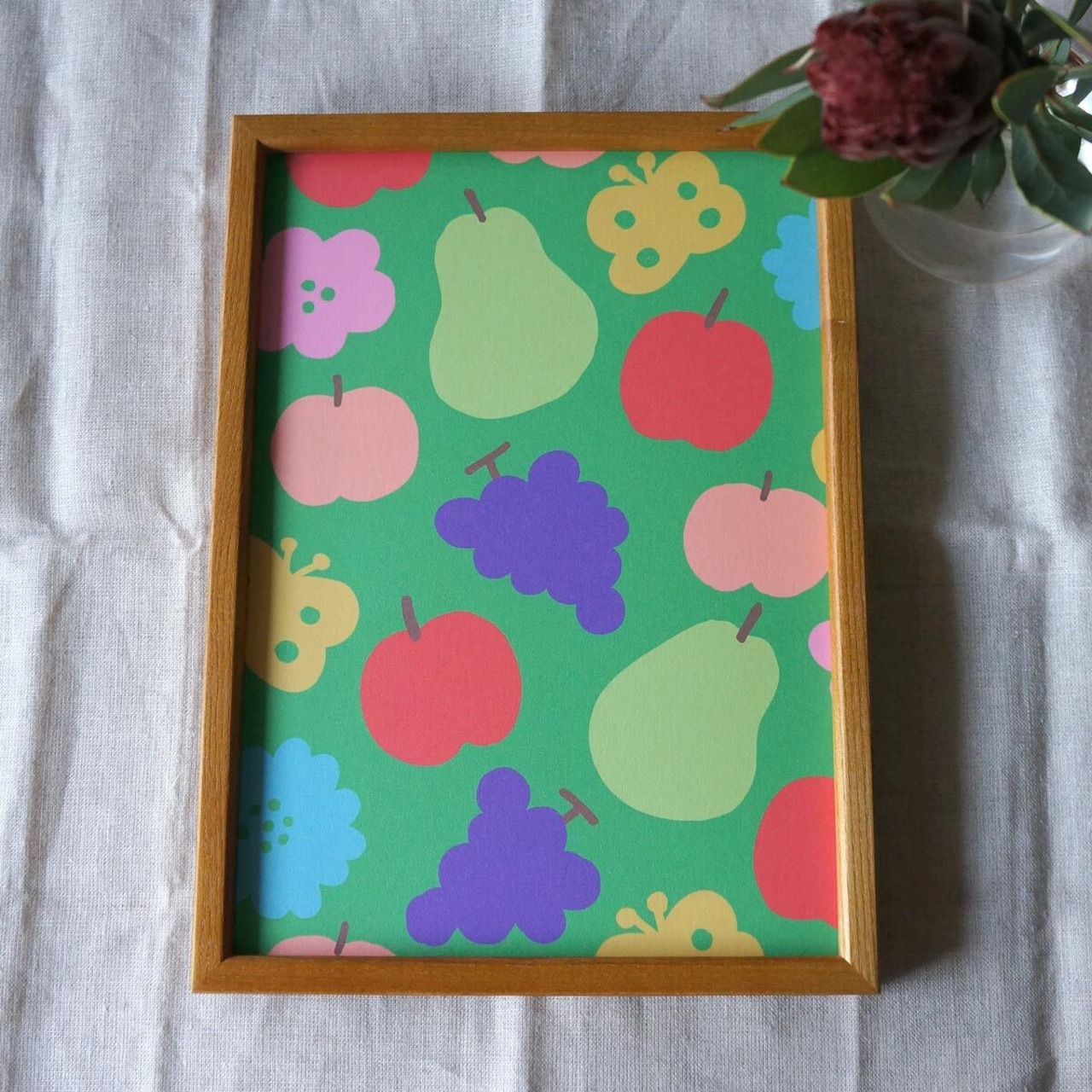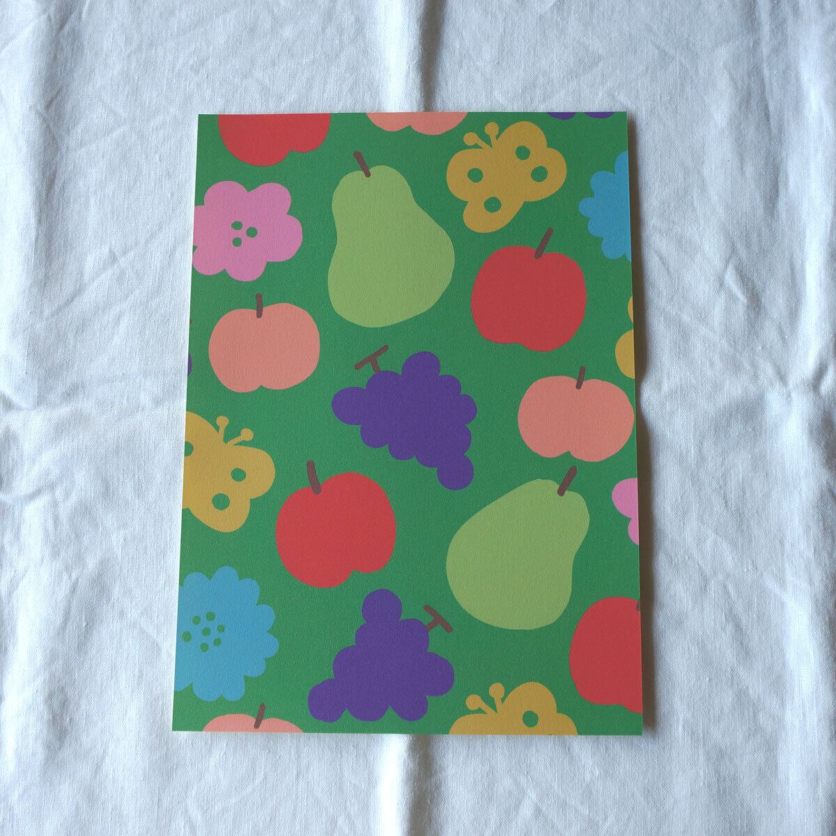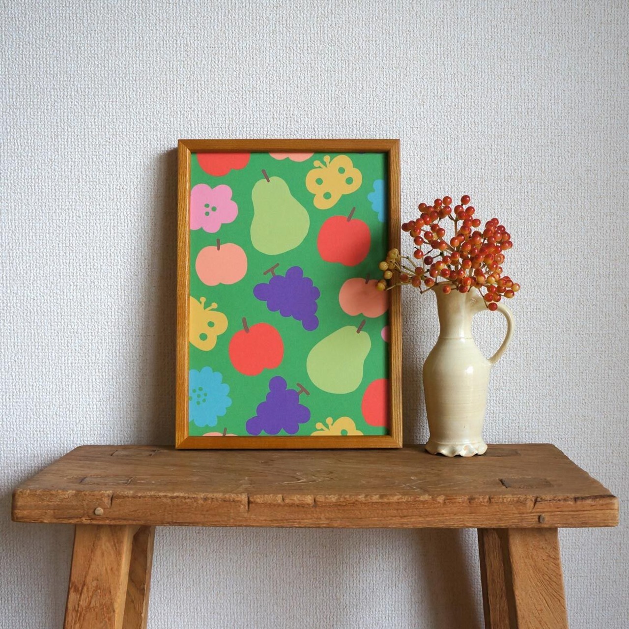 「花と果実と蝶模様(グリーン)」A4ポスター