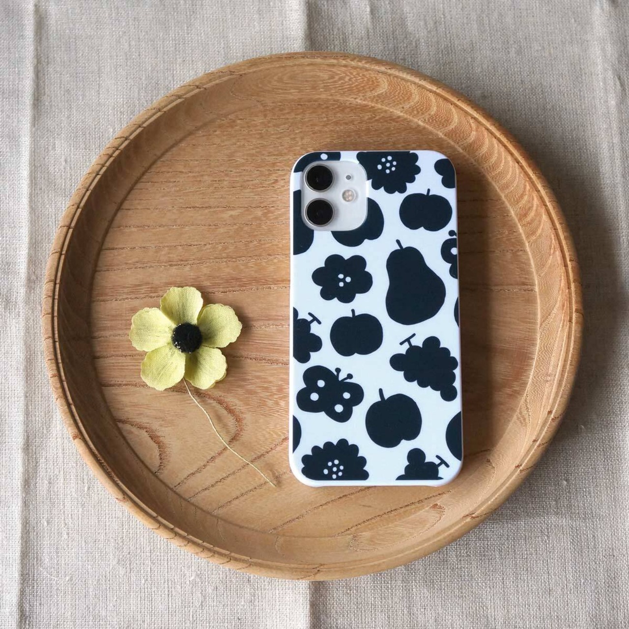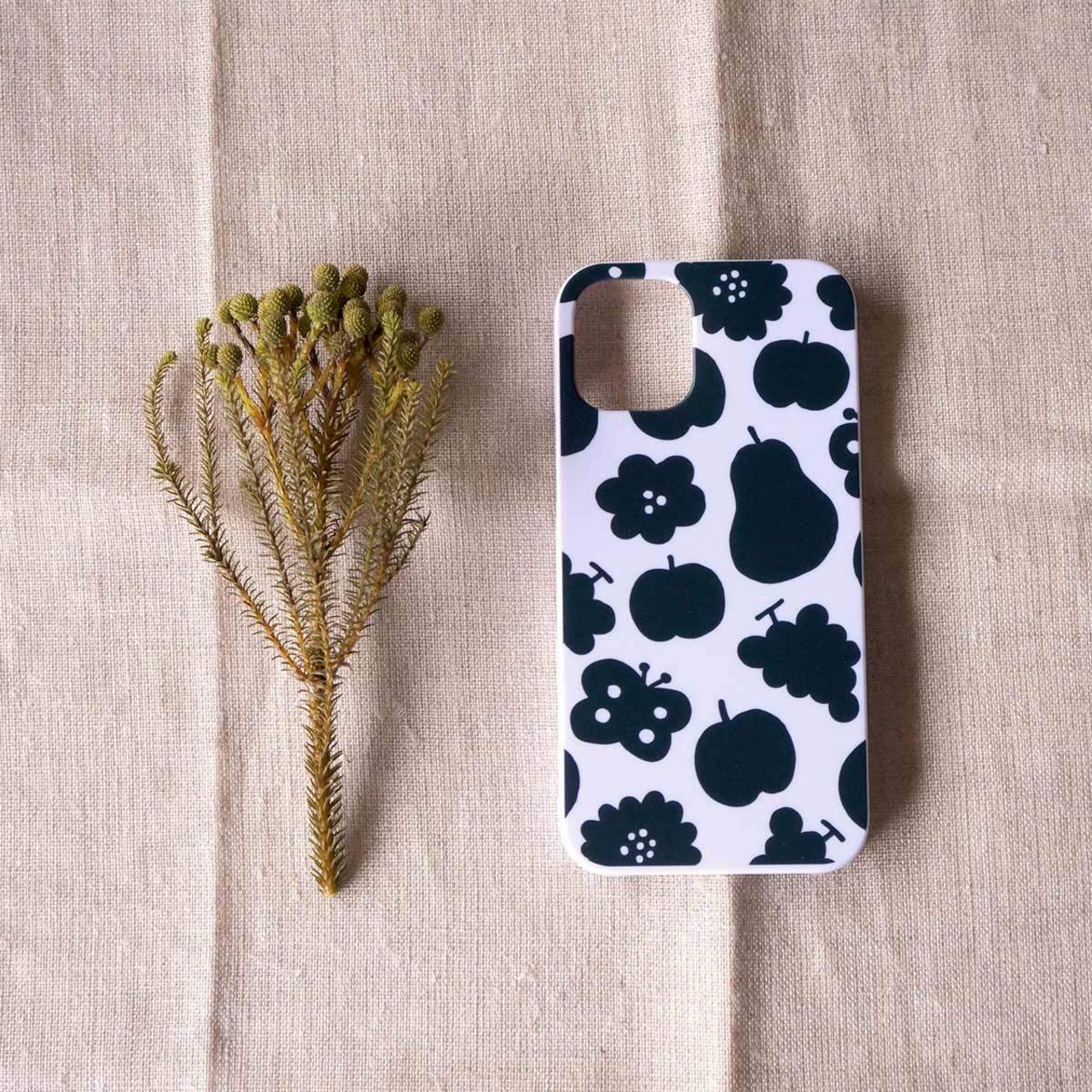 「花と果実と蝶模様(黒)」<ホワイトケース>【 表面のみ印刷 】
