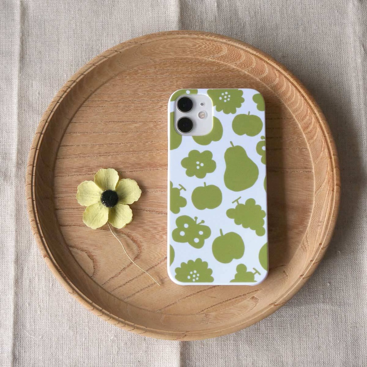 「花と果実と蝶模様(抹茶色)」<ホワイトケース>【 表面のみ印刷 】