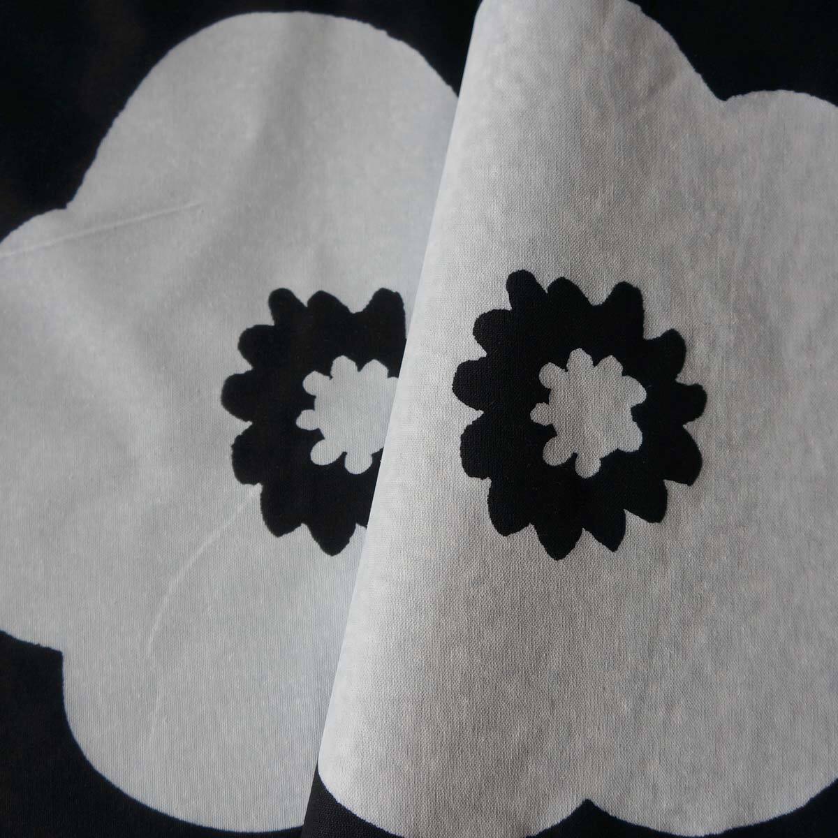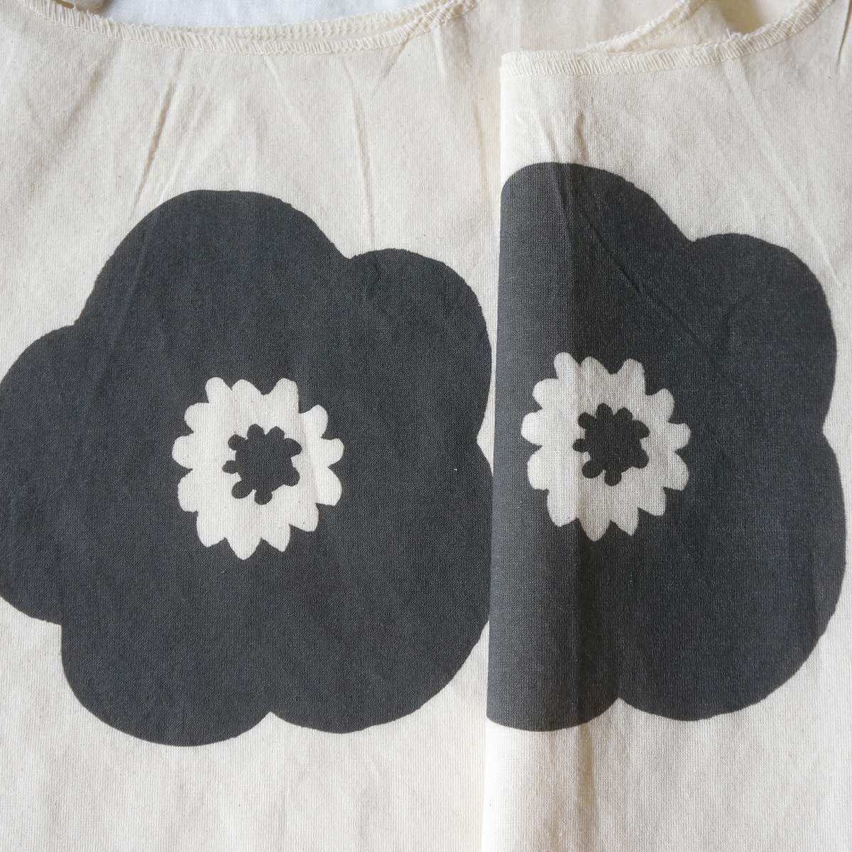 右:洗濯機にて通常の洗濯後、霧吹きをして裏側からアイロンがけ。全体的に一回り〜二回りほど縮んで小さくなり、風合いがやや固いごわっとした質感に変化します。プリントがだいぶ白っぽくなります。